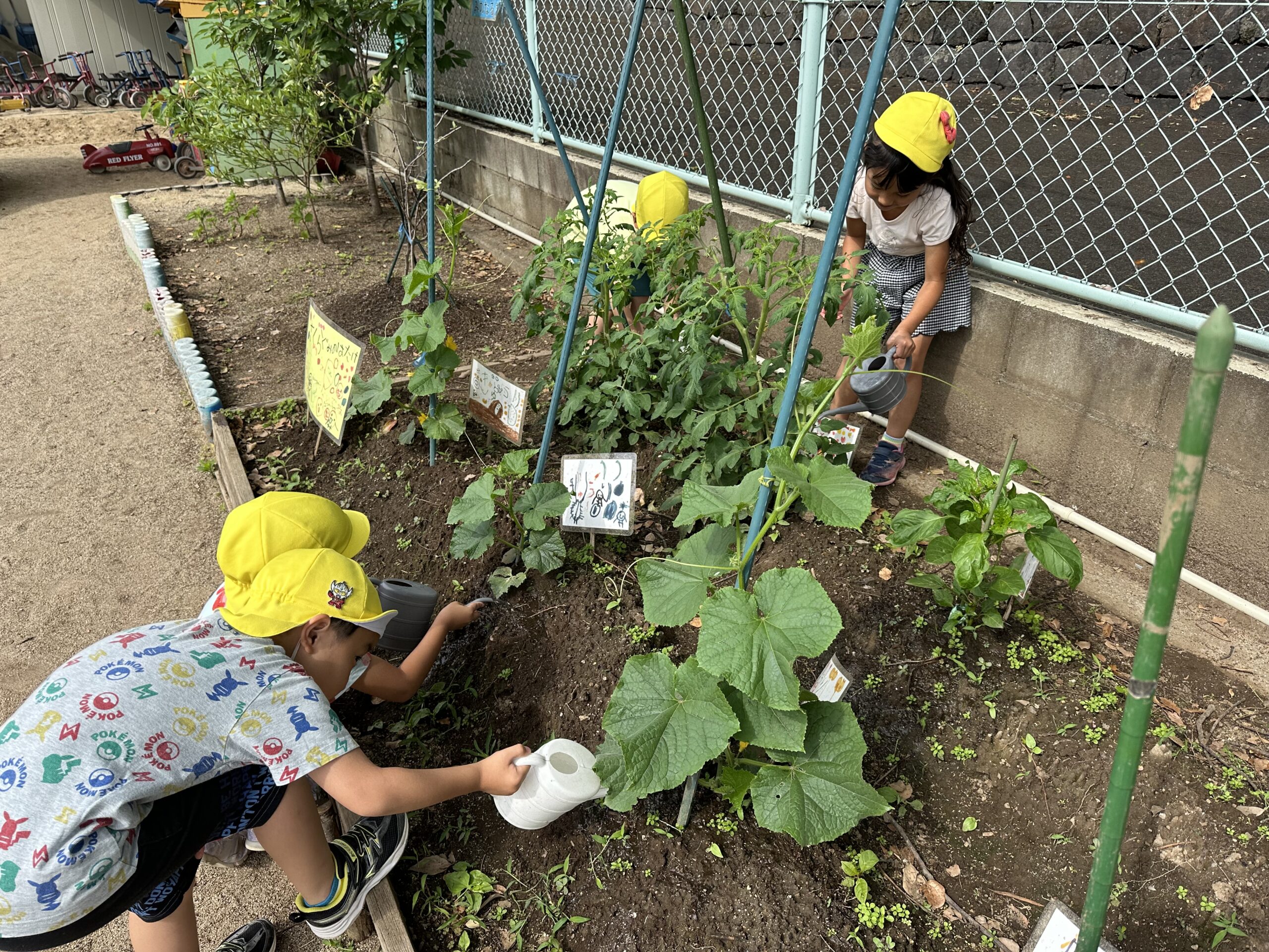 草花や虫、畑など身近な自然とふれあう中で、子どもたちは小さな感動も見逃しません。命や環境の大切さにも気づいています。